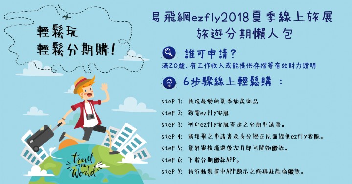 而旅展第3支箭——「旅遊分期輕鬆購」創下國內旅遊電商首例,針對年滿20歲的「千禧世代」,凡透過易飛網ezfly,不須信用卡,本次旅展各類型商品(除機票外),皆可享最高6期零利率優惠。周昀生說明,在數位時代浪潮下,「千禧世代」族群慣於使用不同行動載具接觸各國文化資訊,例如韓劇或日劇等,衍生出可觀的「千禧旅遊商機」,但想出國卻常受制於現金不足或無信用卡的窘境。易飛網洞察這群千禧世代的需求,打造史無前例的「旅遊分期輕鬆購」,替這群「無卡族」找到解方。不過,周昀生也提醒,申請人須在確定半年內財力可支付的前提下,透過簡單6個步驟方可完成申請手續,且繳款「無紙化」、「行動化」,下載APP後,就能手持行動裝置到超商繳款,輕鬆一「指」搞定!