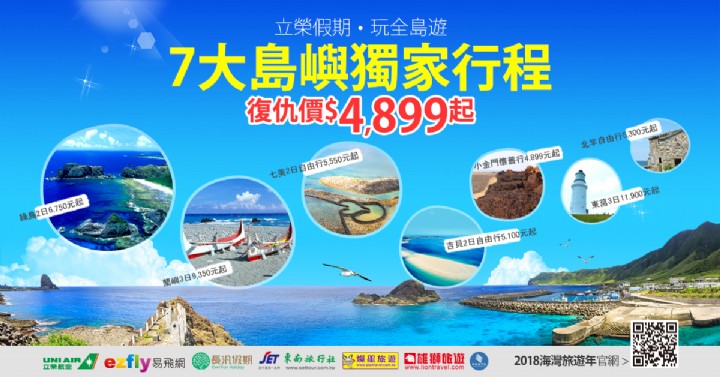 易飛網ezfly不甘國旅市場持續低迷,同時響應交通部觀光局2018海灣旅遊年政策,近期整合旅遊產業上、中、下游龍頭企業,在國內航線最綿密的立榮航空鼎力支持下,於今(5/14)宣布結合5家旅行社共組「海灣聯盟」,即日起至12月31日推出「立榮假期7大島嶼獨家行程」,「復仇價」2天1夜機+酒僅4,899元起,並同步於線上7大官網入口、及線下近250家實體店面進行大串連,力拼7個月內達成「海島復仇旅遊」7,000人次目標,邀請國人「1517你我一起」玩海島!