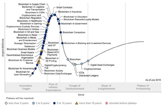Gartner最新2019年區塊鏈商業發展週期報告(Hype Cycle for Blockchain Business,見圖1)指出,未來5到10年內區塊鏈將徹底改變大部份產業的商業模式。