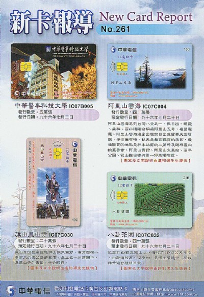 本次發行的新卡,「阿里山雲海」名列台灣八景之一,與日出、晚霞、森林、高山鐵路合稱為阿里山五奇,名聞遐邇。阿里山雲海通常出現於日出或薄暮天氣晴朗、浮雲遍布時,秋天是最佳觀賞的季節,最佳觀賞的地點是神木站前的二萬坪及遊樂區內的慈雲寺、阿里山賓館、阿里山火車站、沼平公園、祝山觀日樓與第一停車場附近。「鳳山寺」位在高雄縣旗山鎮東南郊,寺旁塑有一尊高大的濟公活佛巨像,矗立在一片蔗園中,為鳳山寺的表徵,十分醒目。「八卦茶園」位於竹山鎮東隅山上,海拔約1000公尺左右,由於海拔高、溼度夠,氣候土壤適中,所以非常適合種植茶葉。詳細說明資料,請參閱新卡報導NO.261。