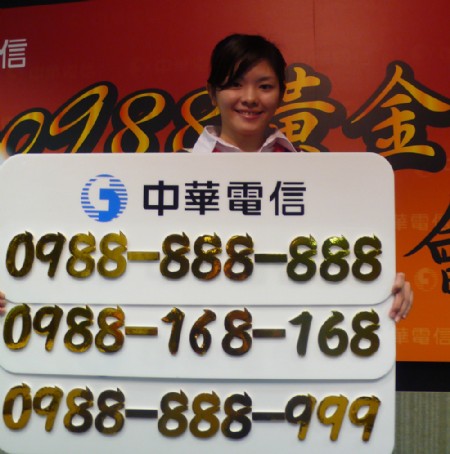 千載難逢、史上難得一見的超級黃金門號「0988-888-888」隆重登場!台灣電信界領導業者中華電信今(21)日公佈10組3G行動電話門號拍賣訊息,此10組門號因連號並具諧音吉祥之意,被喻為史上超級黃金門號,預料將引起許多收藏家關注。