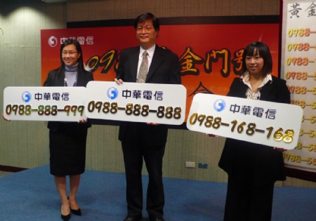 長久以來,中華電信始終默默耕耘、不遺餘力投注社會公益活動,運用企業自身資源贊助各公益團體。這次中華電信首度以競標拍賣會形式進行黃金門號現場拍賣,並將門號拍賣所得全數捐贈給公益團體,中華電信公司協理石木標表示:「企業社會責任在於取之社會、用之社會,並透過分享的力量影響更多民眾參與;中華電信很榮幸能取得10組眾所矚目的黃金門號,並透過公益拍賣活動,動員群眾力量,將愛與希望散播出去,也期望藉『0988-888-888』8個8連號的天王黃金門號庇佑,讓大家一路發。」