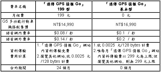 - 「遠傳GPS情報Go基本型」啟用後如轉為其他資費,則無法再轉回「遠傳GPS情報Go基本型」資費。