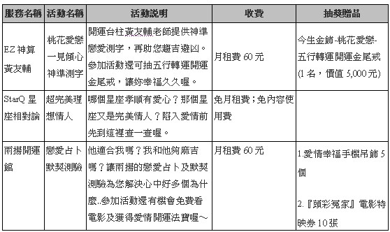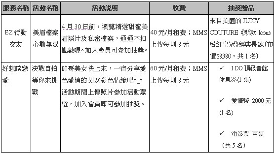 驚蟄過後,大地回春,春花開,您的桃花開了嗎?台灣 3G領導廠商威寶電信自即日起至4月30期間在VIBO行動網-哈燒速報區規劃一「年度交友之星」單元,要讓所有期待戀情花開以及所有愛秀、有自信,想拓展人際關係的用戶,可在此盡情挑戰在【超級人氣星】或【決戰貼圖王】裡拼人氣。【交友開運法】單元則有命理達人為您測字、開桃花及戀愛占卜,提供尋找完美情人撇步,讓威寶用戶在充滿戀愛氣息的人間四月天都能找到屬於自己的真愛。4月底前參加各項活動,就有機會獲贈各項戀愛好禮,包括浪漫的Tiffany項鍊、人氣水鑽手機掛飾及粉紅皇冠經典長鍊;具收藏價值的泰迪黃金熊及百貨禮券;還有頂級會館休息券及電影票,達到為人氣加碼、為戀情加溫的效果。
