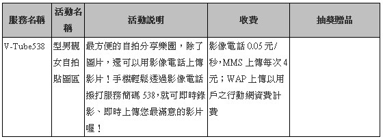 出門旅行不用帶電腦,不用找網咖,只要帶著威寶 3G門號與 3G手機,就能隨時隨地上傳美美的照片,分分秒秒掌握年度貼圖王的競選票數。不僅如此,威寶「V-Tube538」更讓您輕鬆透過影像電話撥打服務簡碼538,隨時錄製影音片段,記錄生活點滴,馬上就能將最HOT的影音內容“上傳分享”給全世界,用照片或影片跟全世界交朋友。
