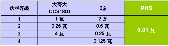 PHS是政府唯一核可低功率無線電話,依DCS1800行動電話機技術及1900兆赫數位式低功率PHS終端設備技術規範指出:PHS最大發射輸出功率僅有0.01瓦(其他系統比較請參考下列附表)。目前雖無確切研究指出電磁波對於人體的實質影響,但發射功率越低,越能使人安心自在地使用行動電話。