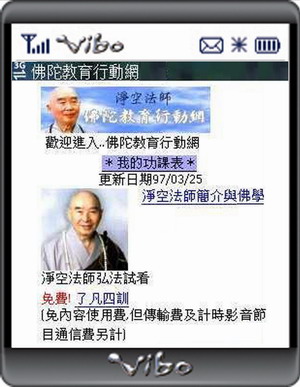 為滿足廣大信眾希望能隨時隨地利用空閒時間聞佛法、結佛緣的需求,威寶電信昨(28)日宣布在「VIBO行動網」首創全台推出「佛陀教育行動網」服務,獨家提供威寶用戶只要透過3G手機,即可線上收看由佛教界極負聲望的淨空法師為弘揚佛法所錄製的講座節目。在節目中,淨空法師以深入淺出的方式及有趣的生活實例來闡述佛經的內容,相信能讓虔誠信眾更容易接觸佛理、體現佛經真義,達到淨化心靈之目的。而威寶秉持服務、回饋用戶的用心,申裝此服務每月月租只要20元,影音節目觀看費用則以秒計費、每秒只收費0.05元。