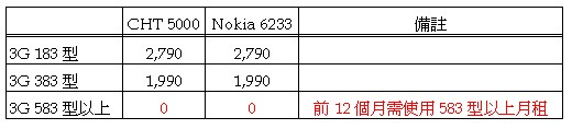 - 活動內容:用戶申租3G 583型(含)以上費率24個月(前12個月需使用583型以上月租費,第13~24個月可改為183以上月租費),可享專案手機(CHT5000、Nokia 6233)零元促銷優惠價。