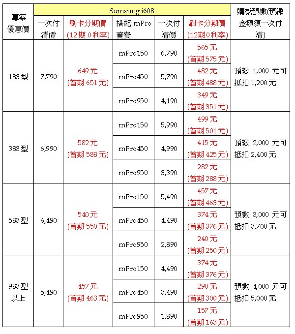 - 活動內容:用戶申購Samsung i608手機,可享信用卡12期分期零利率,再送每月300元通話費12個月,以及『3G無限大亨』免12個月資訊月租費優惠