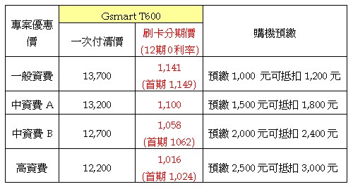- 活動內容:用戶申租Gsmart T600手機,可享信用卡12期分期零利率,每期最低1,016元起,再送每月400元通話費12個月,以及MSN服務12個月,若客戶於購機時申租mCool 49,即可享免收mCool 49型上網月租費,及免收手機上網傳輸費優惠12個月。