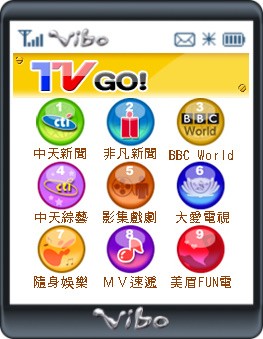 「TV GO!」有九個線上電視節目頻道,囊括國內外新聞、最Hot的綜藝節目、影劇電影、歌手MV及美眉寫真等多元精彩節目內容,任君選擇。全面性的行動電視,簡潔的操作介面,還有每日節目表可隨時查閱,精彩節目不錯過。