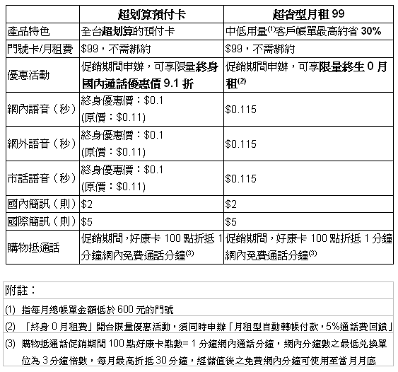 台灣量販通路龍頭家樂福正式於10月30日推出『家樂福電信』進軍台灣的行動通訊市場。本著「天天都便宜」的服務宗旨,『家樂福電信』針對以行動語音通話及簡訊為重要需求的消費者,推出「超划算預付卡99」以及「終身0月租」兩種資費方案;不分網內、網外、市話的透明單一計費方式,讓行動電話支出簡簡單單,消費者將不再被繁瑣的費率計算方式困擾。在「超划算預付卡99」資費上,促銷期間申辦可享「終身」語音通話9.1折,優惠價每秒鐘0.1元,為目前市場上超低價的預付卡資費,而終身0月租方案,促銷期間申辦可享終身0月租,打多少、付多少,且不需綁約,語音優惠價每秒鐘0.115元。