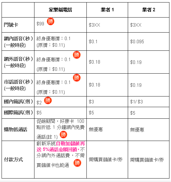 家樂福電信同時推出預付與月租門號:擁有全台超划算的預付卡費率、與最高約省30%通話金額的月租型門號服務,讓消費者真正感受到在家樂福電信,天天溝通都便宜。例如:在促銷期間,「超划算預付卡99」門號卡門檻全台最低,且享終身9.1折的超優惠價每秒0.1元,與月租型「終身0月租,打多少付多少」每秒0.115元兩種超省錢資費方案。不管網內、網外或市話,通通網內單一價格,簡單透明的費率計算方式,讓消費者不因複雜的通話費率而煩惱,輕鬆享受,服務無折扣。