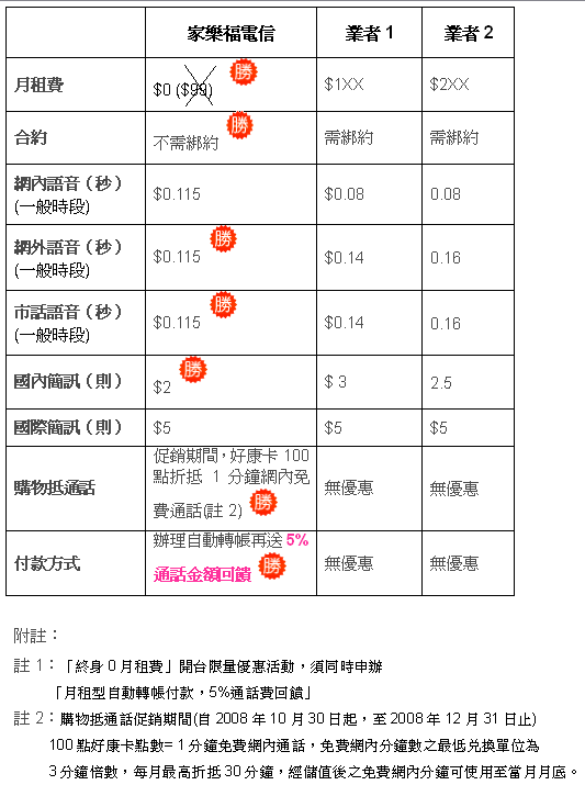 讓每月〝0〞電信費率支出的夢想成真!持有「家樂福好康卡」的會員,購物消費集好康卡點數,還可以抵通話金額,提供消費者双重享受的好康服務。促銷期間:點數折抵通話分鐘數,好康卡會員每買1元商品立即贈送1點,集滿100點,可折抵網內通話1分鐘。民眾在家樂福賣場購買3000元,即贈送網內免費互打30分鐘。只要每月消費金額滿3000元,中低用量行動電話用戶就有可能夢想成真,達到每月〝0〞電信費率支出!