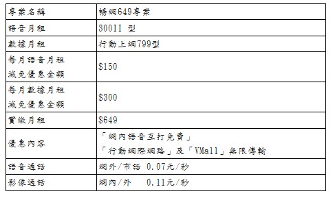 離學生時代很久了但還是想要超值優惠?想要隨時無限上網又擔心資料傳輸量一不小心就爆表?想要和朋友暢快通話又怕每月通話費太高?想要智慧型手機又怕價格太貴?您的煩惱威寶通通都知道!站在您的角度為您想的威寶電信全民半價649方案,提供:1.網內互打免費、2.網外費率超便宜一分鐘只要4.2元、3.無限上網吃到飽,飆網不塞車還超快速、4.智慧型手機0元就可帶回家等超級優惠,威寶一次滿足您所有需求。