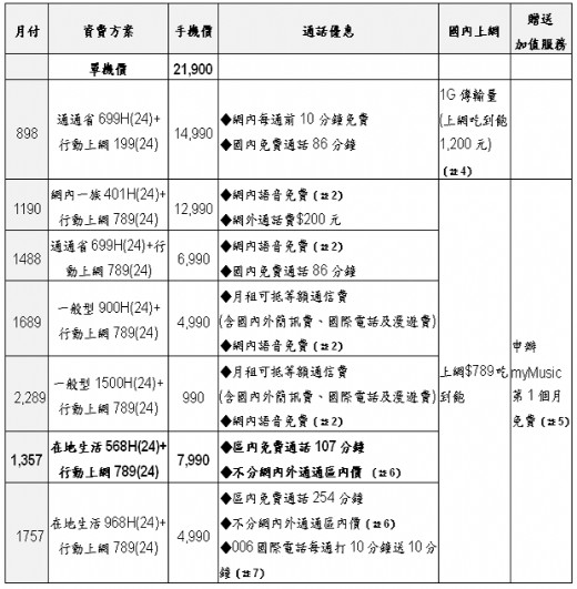 註1. 手機價格需簽約24個月,搭配指定語音資費及數據資費24個月,並須預繳10個月語音及數據月租費;刷卡可享6期分期0利率。