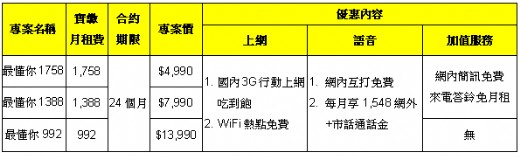1.以上「最懂你1758」、「最懂你1388」及「最懂你992」專案價須綁約24個月,提前終止租用均需繳納補償金,相關購機、預繳規定及相關內容,以申辦現場優惠方案同意書為準。