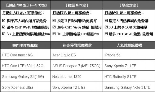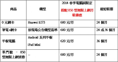 *2014春季電腦展現場優惠方案不可與其他優惠重複申辦,超值fun案(一年方案)租期12個月,輕鬆fun案租期24個月,學生方案(不含650型行動上網方案),詳細購機先繳納金額等包裝內容、各場次購機方案實際之適用機型及方案購機價,請以2014春季電腦展現場公告為準。