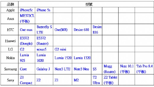 3. 終端設備:支援手機、平板、行動分享器等設備種類多樣,例如HTC OneM8 、Butterfly S LTE、 Samsung Note3 LTE、 S5等 (詳附表一)。