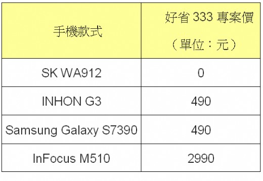 台灣之星「追求最佳C/P值」的資費設計概念同時也延伸應用在專案搭配的手機上,「好省333方案」可搭配選購多款超夯、大螢幕智慧型手機,專案價只要0元起就可帶走,包含4吋SK WA912、Samsung Galaxy s7390、4.7吋INHON G3,就連最新上市的5吋4G LTE InFocus M510高階機種,也只要專案價2,990元就可輕鬆帶回家,智慧型手機既有最經濟實惠入門機種可選,也有超值旗艦機種可挑,想聰明消費,「好省333方案」絕對讓您滿意!