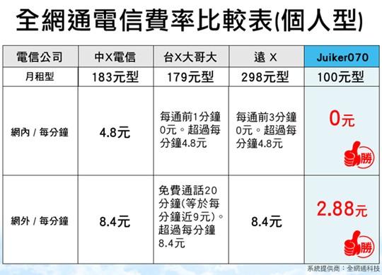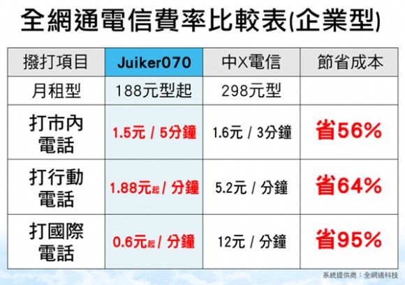 國內具有E.164特殊二類電信執照的全網通070電信業者則率先響應政府政策,在今年8月12日即與工研院Juiker揪科簽訂合作合約,利用Juiker揪科OTT(Over-the-Top)平台,整合全網通070強大的電信資通訊網路,除讓企業進行節費電話之功能,除提供「企業專屬Juiker揪科通訊錄」之外,最強的地方莫過於「群組節費電話」設計,「Juiker 揪科」主要強項在於整合企業通訊錄服務,並且整合完整的電信商節費通話,簡單形容就是:「用Juiker揪科打電話,當有網路時就走免費網路電話,但當對方手機網路狀態不佳時,就使用Juiker 揪科070電信節費方案」,這與市面上其他VoIP通訊APP等APP的屬性並不相同,反而在電話通訊上更加貼心, 整合企業通訊錄感覺非常便利,尤其是數千數萬人的公司,有時候想找某位員工或主管時還真困擾,透過「Juiker 揪科070」服務整合之後,就能快速進行查找,而且可以選擇使用「免費網路電話」或是「Juiker 揪科070節費電話」 來與對方通訊,達到網路電話免費通訊或電信網路省話節費,公司行號導入 Juiker 服務,可以方便員工查詢到全公司所有人的電話、分機,並且可以用最經濟(節費)的方式來進行對談,不僅可以替員工或公司(公務電話)省荷包,更可以讓員工之間透過語音、文字交談來做聯繫,過程之中也能保有企業在意的隱私問題,同時還能在上面舉辦活動、公佈企業政策,相當的方便!未來一般民眾也只要由現有智慧型手機,下載Juiker揪科APP,並從11月初到超商購買儲值卡或進全網通070官網申請成功後,即可享有網內互打免費,網外最低每分鐘只要1.88元起,創全台最低的電信費率。