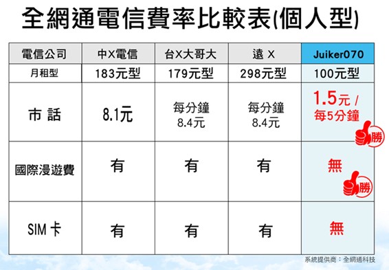 負責多方結盟的全網通070科技公司董事長林瑋軒表示,利用Juker(揪科)APP軟體,除了讓公務單位能享有超低話費外,就連公司企業、甚至市話都可以透過申請全網通070實體門號,享受超高價值的節費費率。