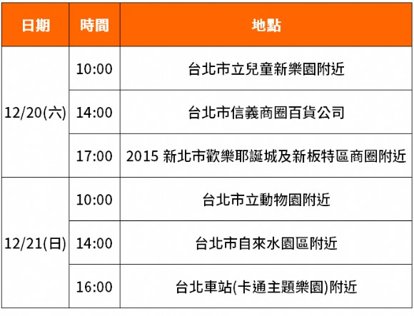 本週六早上「大玩」與「特玩」將帶著驚喜小禮物,出沒在臺北市立兒童新樂園附近,下午前進到台北市最熱鬧的信義商圈、新北市歡樂耶誕城、新板特區附近商場等地現身,本週日則將在台北市立動物園、台北公館自來水園區、台北車站主題樂園一帶出沒!如果幸運遇見他們,可拿出手機拍照上傳到「大玩特玩同學會粉絲團」,將可參加抽獎,有機會獲得可愛又實用的「大玩特玩限量酷袋」!