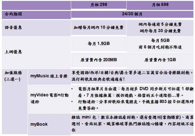 台灣大7/10上線的超低入門資費,月租只要298元,平均1天10元有找,除了加量享4G上網1.5GB(原傳輸量200MB),搭配多款4G熱門機款外,合約期間,還可擁有myMusic、myVideo搭配行動達鈴、myBook等加值服務三選一的超值服務,攜碼憑帳單、老客戶還享免預繳優惠。同時,也同步推出698方案,每月可享上網5GB的傳輸量(原傳輸量1GB),並額外再加碼前6個月不降速,讓您暑假也可4G一夏。
