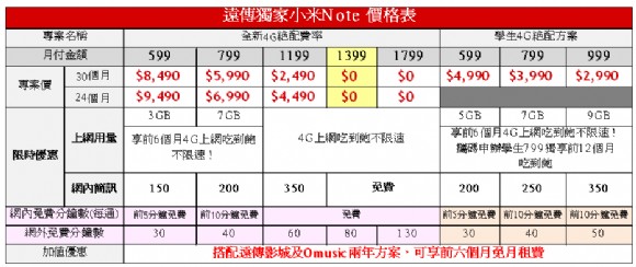 小米Note單機售價$12,499,搭配遠傳全新4G絕配費率專案價如下: