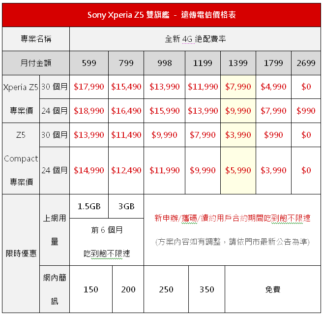 Sony Xperia Z5、Xperia Z5 Compact搭配遠傳資費方案:
