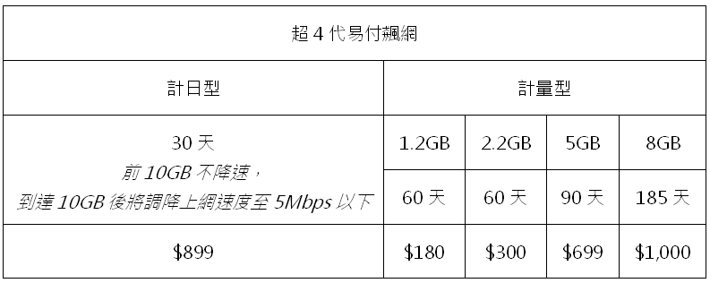 類似這樣的小量上網需求,則可考慮原4G「超4代易付飆網計量型」商品,不僅數據流量從1.2GB至8GB不等,使用天數也從60天至185天都有的選擇。其中數據流量為1.2GB/$180及2.2GB/$300兩種方案最為熱銷,1.2GB除可發送即時通訊軟體高達5萬筆訊息,使用期限也從30天增長為至60天,讓消費者能更有效的利用上網流量。