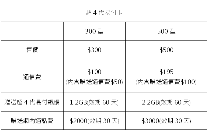 針對同時有上網和通話需求的消費者,遠傳超4代易付卡有300型及500型兩種選擇,加贈網內通話費$2,000~$3,000,再享1.2GB~2.2GB上網傳輸量,語音、上網皆可享有超值優惠。