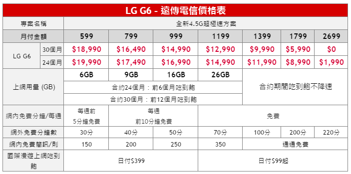 遠傳4.5G x LG G6買大送大萬元好禮 月付1399 手機$9,990