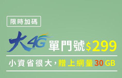 參加本活動,選擇上述月繳299元方案者,享一次性加贈上網量30GB;月繳399元方案者,享一次性加贈上網量50GB;月繳599元方案者,享一次性加贈上網量100GB。贈送之上網數據傳輸量依申辦當時搭配之方案而定,不隨資費調整而改變。