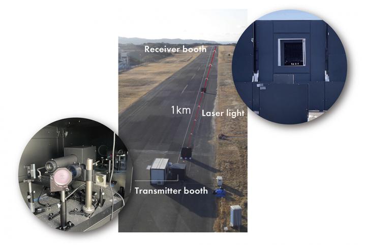 實驗於和歌山縣白濱町的南紀白濱機場跑道進行(2025年1至2月)。研究團隊刻意把雷射光軸壓低到離地約1公尺、且近水平傳送,使其最大限度暴露於地面加熱與亂流影響,模擬惡劣戶外場景。發射端產生約1035W光功率,經DOE整形與導引,穿越1公里開放空域抵達接收端。結果顯示,平均接收152W電力、效率約15%,並完成30分鐘連續穩定供電驗證。