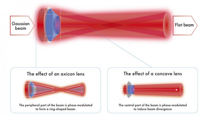 NTT在發射端導入光束整形,使光束經長距離傳播後仍盡量趨於均勻強度。其設計思路是把外環能量形成環狀成分、中央則做相位調制,兩者在傳播過程逐步疊合,於目標距離(本次為1公里)形成近似「平頂」的強度分佈。實作上以**繞射光學元件(DOE)**落地,並配合光束導引(beam steering)精準指向接收面板。