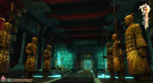 高大的兵馬俑列隊道路兩側,象徵著皇權以及始皇至高無上的地位,這樣戒備森嚴設計井然有序的地宮之中到底埋藏著怎樣的秘密呢?史料記載,在秦皇陵之中,大量水銀的應用力求表現中原河山的壯麗錦繡。這次我們看到的開發中畫面中種種特效還尚未添加,而在添加了特效後的實際遊戲畫面中,兵馬俑旁浮橋之下將可以看到水銀灌注的河水緩緩流淌,更添震撼之感。