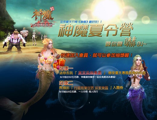 這個夏天該玩什麼哩?告訴你,來玩《神魔Online》就對了啦!全台70萬玩家的高度肯定,絕對是2011年不可錯過的絕佳大作啦!即日起,只要加入會員,就送你兩大好康!好康一,送你去玩「東京恐怖學園」,感受夏天寒風刺骨的快感。東京恐怖學園是日本台場怪奇學校團隊2011年來台推出的最新日式鬼屋,去年展出在兩個月內創下10萬人次體驗,排隊高達6小時之久!還有好康二,送你去月眉育樂世界探索樂園High一夏,一人中獎,兩人同行唷!