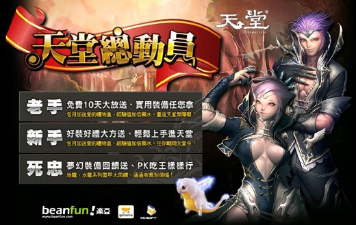 為感謝玩家們長達11年的支持,特別規劃推出「天堂總動員」活動!只要持續支持天堂的死忠玩家,可依符合的活動資格領取到頂級「法利昂系列」或是「安塔瑞斯系列」盔甲一件!另外,符合活動資格的天堂老手玩家,也可領取限量的免費遊戲天數10天、「頂級嘯龍裝備」一套及老手特享道具組。在活動期間新加入天堂的玩家,也可獲得頂級嘯龍裝備一套及新手嘯龍道具包,讓你輕鬆上手上天堂!除此之外,不論你是新手老手,只要使用包月制將可額外獲得超值好禮,包越久領越多,這麼好康的機會千萬別錯過!