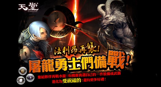 同時,全面召募屠龍勇士團,趕緊挑戰成為新一代的馴龍高手!「隱魔狂襲」改版啟動後,玩家即可挑戰強大的「水龍-法利昂」,只要在全伺服器中、改版後最短時間內推倒「水龍-法利昂」的玩家,將可選擇角色身上的一件防具或武器,變更為「受祝福的」狀態。此外,擊敗「水龍-法利昂」的勇士還有機會獲得「法利昂徽章」!累積1個以上的徽章,可換取具有一定機率降低魔法傷害力50%及寒冰耐性+3的「弱化的水龍之魔眼」。累積3個以上,更可兌換藏有「幼龍蛋」的「屠龍寶箱」。勇士們!天堂英雄榜等你來進駐!