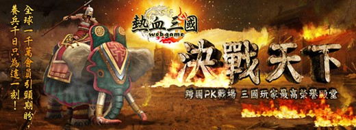 榮耀的戰場,巔峰的對決,行走在渲染著熱血與激情三國世界中,誰又將續寫一個全新的戰場傳奇?《熱血三國Web》新版本「決戰天下」的國際戰場正在召喚你!想學習古代黃忠收川立大功嗎?想效法現代陳信安捍衛瓊斯杯為國爭光嗎?為台灣決戰國際,我們需要你!