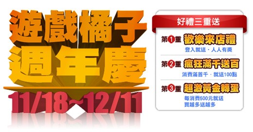 玩家在週年慶活動期間登入《beanfun!樂豆》,就有機會隨機獲得非賣品的《天堂》「天堂橘子週年慶禮包」、首次推出的《新楓之谷》「紅色設計師椅」、專為遊戲橘子週年慶打造的《跑跑卡丁車》「橘子氣球」、獻給初心者的《幻月之歌》「新手實用組合」和《艾爾之光》「熱血新人箱」,另外還有《絕對武力CS Online》「骷髏頭噴漆(1日)」、《狩神伝》「狩神天界全餐」、《瑪奇Mabinogi》「新夢想生活VIP服務(3日)或隨機指定染色劑(2個)」、《龍之谷》「復活書(10個)+緊急HP藥水(3個)+緊急MP藥水(3個)」、《爆爆王》「天空水球」、《百變恰吉》「(膠囊)夢幻的宙斯護身符(5個)、《戲谷麻將》「水晶玫瑰印記」、《決策三國》「甲子金獅」、《?神》「七天坐騎絕影」、《熱血三國》「黃金寶箱鑰匙組」等人氣登入禮。此外,在週年慶活動期間也推出了二重送「瘋狂滿千送百」,玩家在首次消費滿1,000時,就送樂豆點100點!