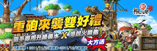 《新楓之谷》年終壓軸改版「傳說LEGEND」的三大新職業 –「重砲指揮官」、「精靈遊俠」與「惡魔殺手」,魔幻般的職業技能備受玩家期待,為了倒數迎接「重砲指揮官」的登場,特地在11月23日至12月7日推出「重砲來襲雙好禮」系列活動,玩家將透過「海賊王的寶物」與「加加的新事業」兩大活動,獲得超優獎勵。