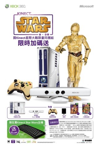 即日起至5月31日為止,購買《Kinect星際大戰》主機組合,內含Xbox 360限量版主機、限量版Kinect感應器、限量版無線控制器、320GB硬碟、《Kinect星際大戰》遊戲、《Kinect大冒險》遊戲,估計零售價新台幣13,980元;寄回主機外箱條碼及發票正本,就加碼再送價值新台幣1,990元的Microsoft Arc鍵盤。迎戰漲潮不必犠牲娛樂及品味,擁有遊戲娛樂及時尚3C配件就趁現在!詳細活動規定請參閱http://www.xbox.com/tw。