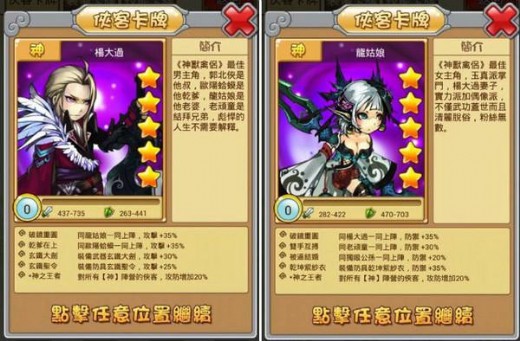 想成為武林至尊,單打獨鬥是不夠狠的,手中一定要握有幾張「王牌組合」才能勝券在握!大笑江湖中的「俠客組合」系統,可以讓俠客們配在一起產生莫名的化學變化,引發特殊技能!人人稱羨的必勝組,千古流傳的佳偶-楊型男及龍姑娘,Match 在一起威力可是驚天動地,一發不可收拾啊!