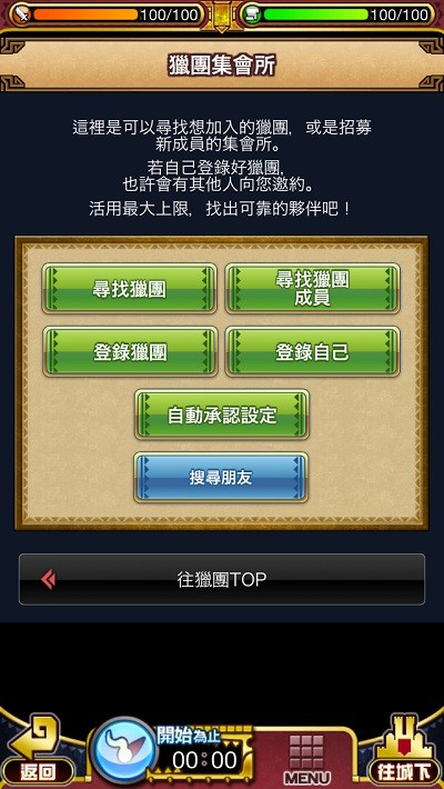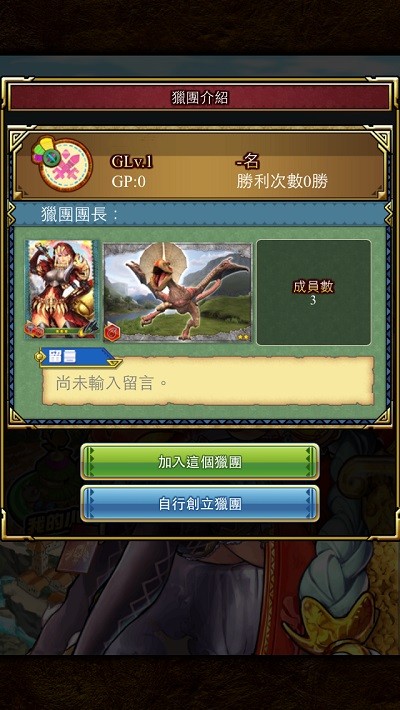 在進入大狩獵的起初,通過一連串的新手獵人教學引導後,系統便會推薦獵人們加入一個女王挑選的獵團,若是不想加入推薦的獵團也可以選擇自行成立全新獵團。獵團預設的名稱是獵團長的名稱,不過這個隨時可以進行修改。獵團成立之後,若想要順利招募團員,則可到「獵團集會所」進行獵團登錄;登錄時可以將獵團整體的遊戲氛圍以及狩獵熟悉度作簡單的分類選擇,也可再加上對於招募者的說明文字,擅用分類功能招募到志同道合的獵友,才能夠享受愉快無比的獵團狩獵生活!