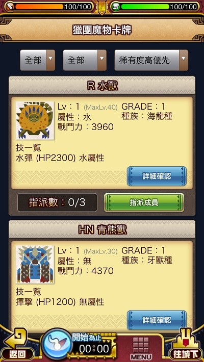獵團要強大,除了每位團員對於自身牌組能力的追求以外,召喚獵團魔物進行攻擊也是相當重要的一環。在進行「大狩獵獵團對戰」時,獵團當中魔物卡片適當的分配到獵人身上,並且在戰鬥進行中相互配合、支援,即可順利獵殺魔物。獵團創立時系統將自動派送三隻魔物,若想要擁有更強力的魔物,則可以透過探索任務中的「搬蛋挑戰」、緊急任務的「獵團排名」獎勵、「秘境探索」等等管道取得。想要提升獵團魔物有兩個方法,一是「大狩獵獵團對戰」期間召喚出獵團魔物參戰取得經驗值,提升魔物「等級」;二是當獲得相同魔物卡片就有機會可提升魔物「階級」,階級越高的魔物能使用附帶狀態效果的技能也越多。擁有強大SR級獵團魔物,是爭取獵團排名頂點的最佳助力!
