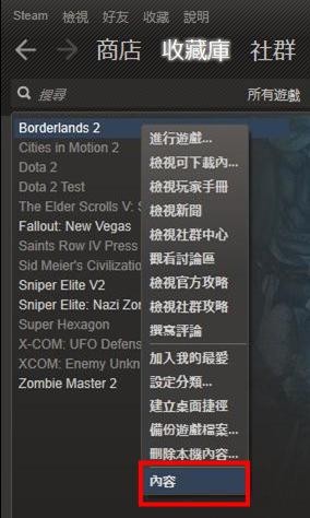 2. 選擇遊戲清單中欲中文化的遊戲,右鍵點選「內容」,進入遊戲細部選單。