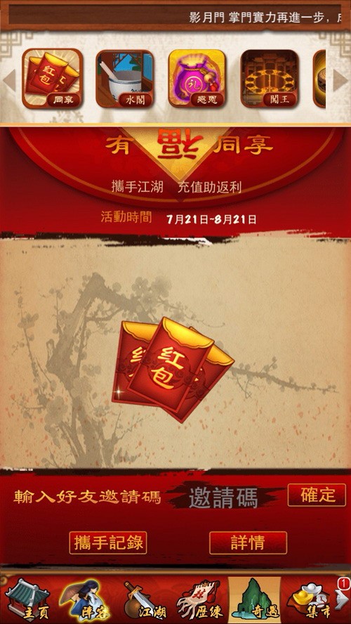 俗話說有人的地方就有江湖,武林中除了個人英雄主義,更需要親情、友情、愛情……讓我們一起結伴江湖,攜一、三、五個好友,或拔劍切磋、或舉酒高歌、或攜手闖江湖,這份兄弟情我們永記心中,遇到了就讓我們相互珍惜肩並肩創武林霸業, 7月21日更新後,結伴江湖將全面升級,邀請好友除了能立刻獲得大量獎勵外,還能領取額外送出的超值豪禮,如此良機,玩家們怎可錯過機會。