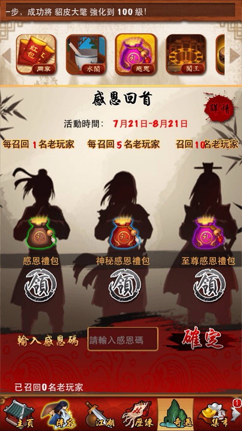 《新大掌門》7月21日到8月21日玩家可在平台中,向符合回歸條件的老玩家發送邀請,並向他們索取「老玩家集結號」活動中獲得的感恩碼,拿到感恩碼後在遊戲內「感恩回首」活動頁面就可兌換感恩禮包。